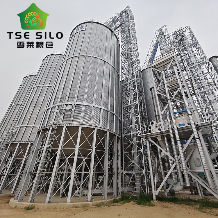 锥底钢板仓,也称为锥底钢板仓、锥底仓或者锥底钢板筒仓,是一种具有锥形底部的镀锌波纹板装配式钢板筒仓,分为仓顶、仓体和锥底三部分,主要用来储存自由流动性好的颗粒状产品如玉米、大米、小麦、大豆、饲料颗粒和塑料颗粒等物料。锥底粮食钢板仓竖立在支撑钢架结构上,使存储的产品可在重力作用下轻松自卸载。装配式锥底粮食钢板仓筒仓壁板为波纹状,内壁光滑且没有台阶或法兰,从而使存储的粮食容易从筒仓排出。底粮食钢板仓筒仓与地面有一定的高度,从而防止存储物料潮湿并使相邻钢板仓之间通过传送装置互连互通,从而方便粮食按需提取。